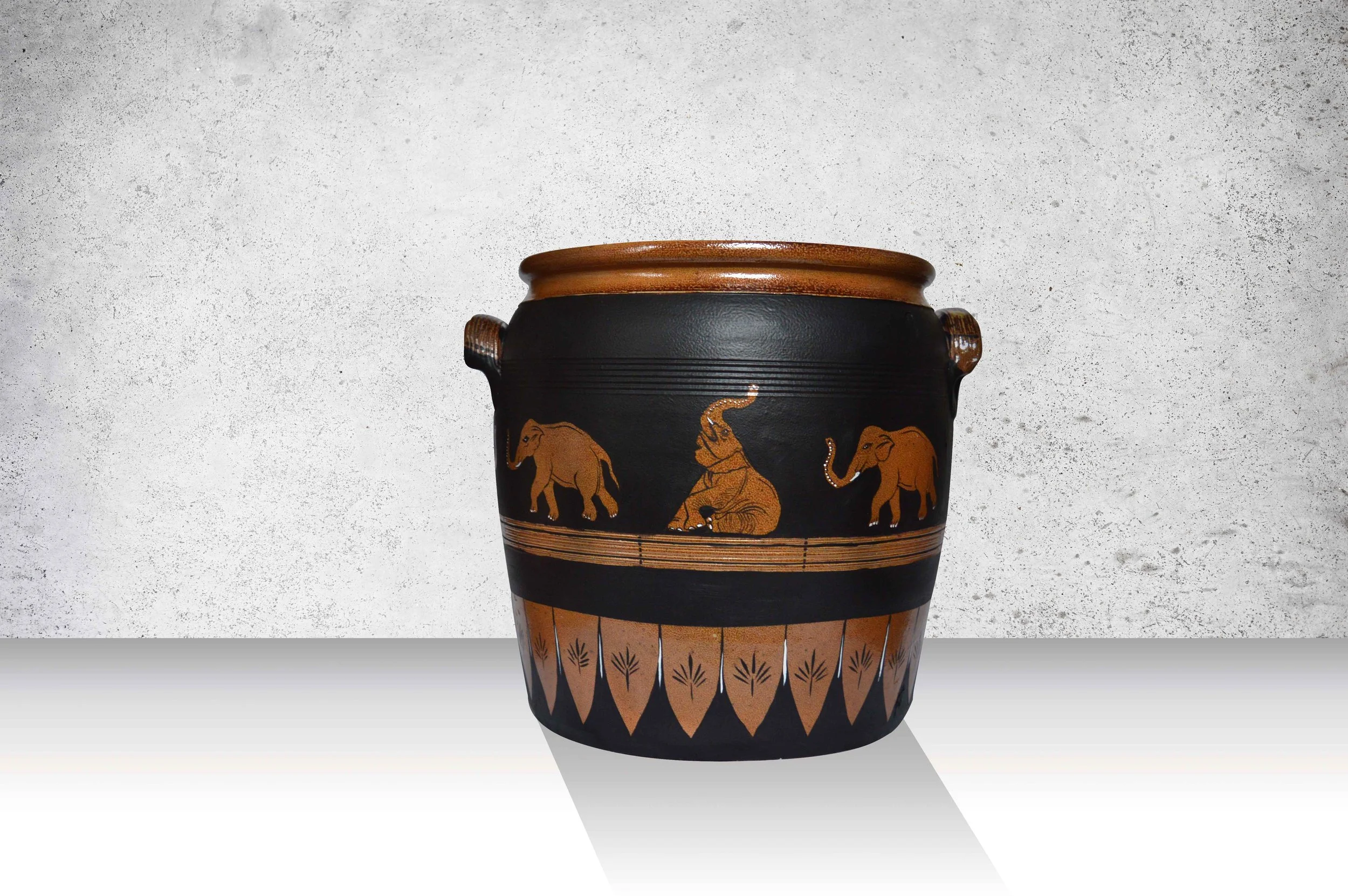 Authentique pot en grès glacé dans de subtiles nuances brunes repeint à la main.